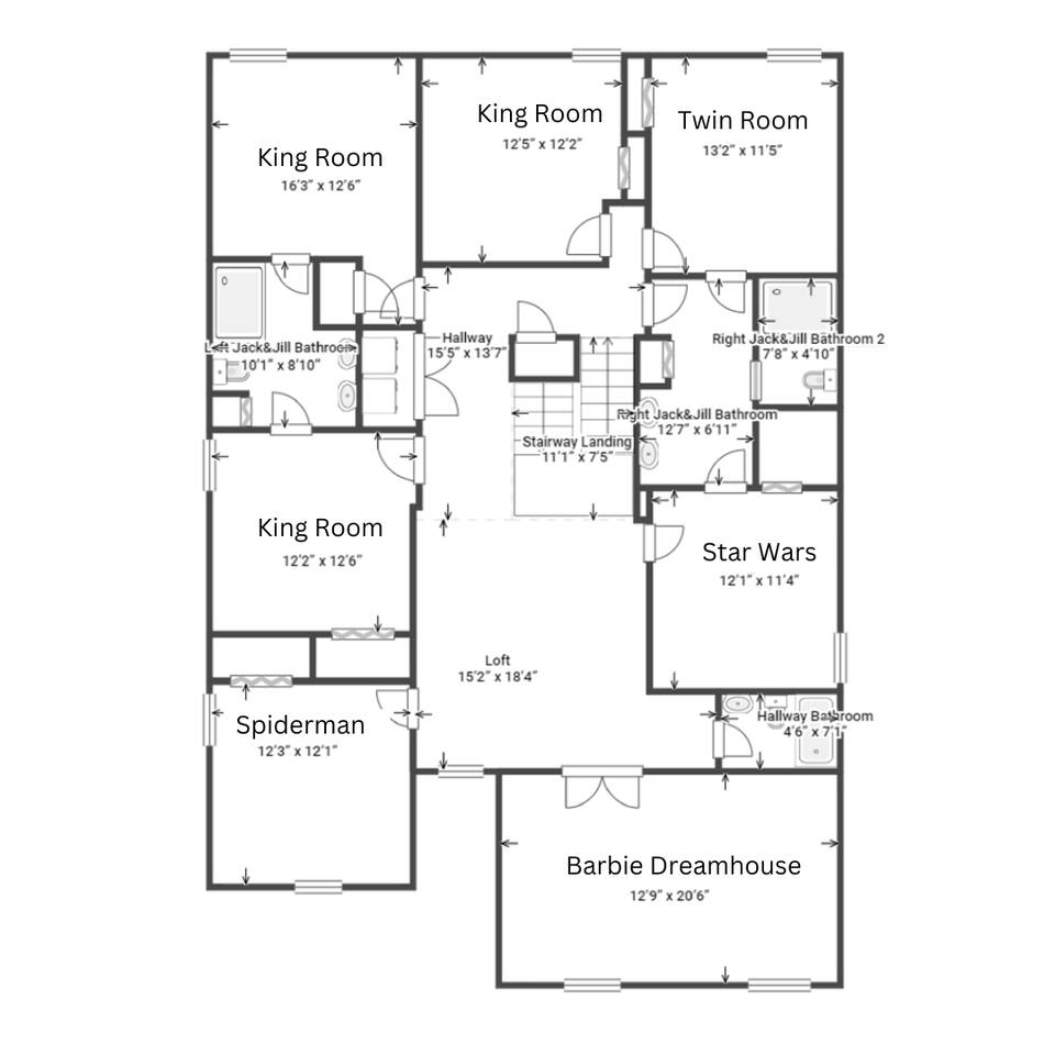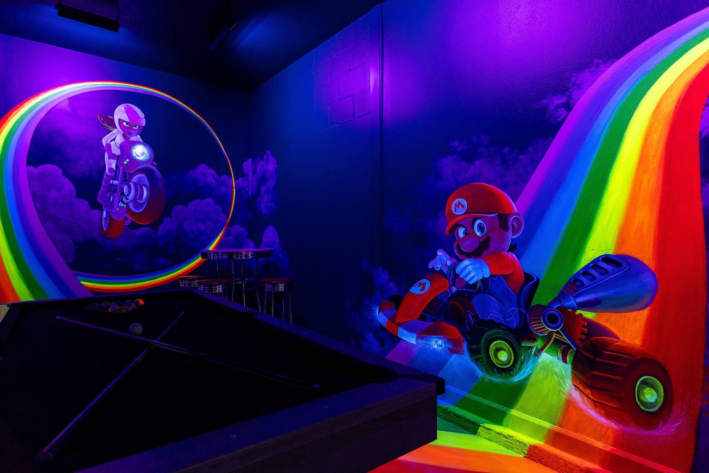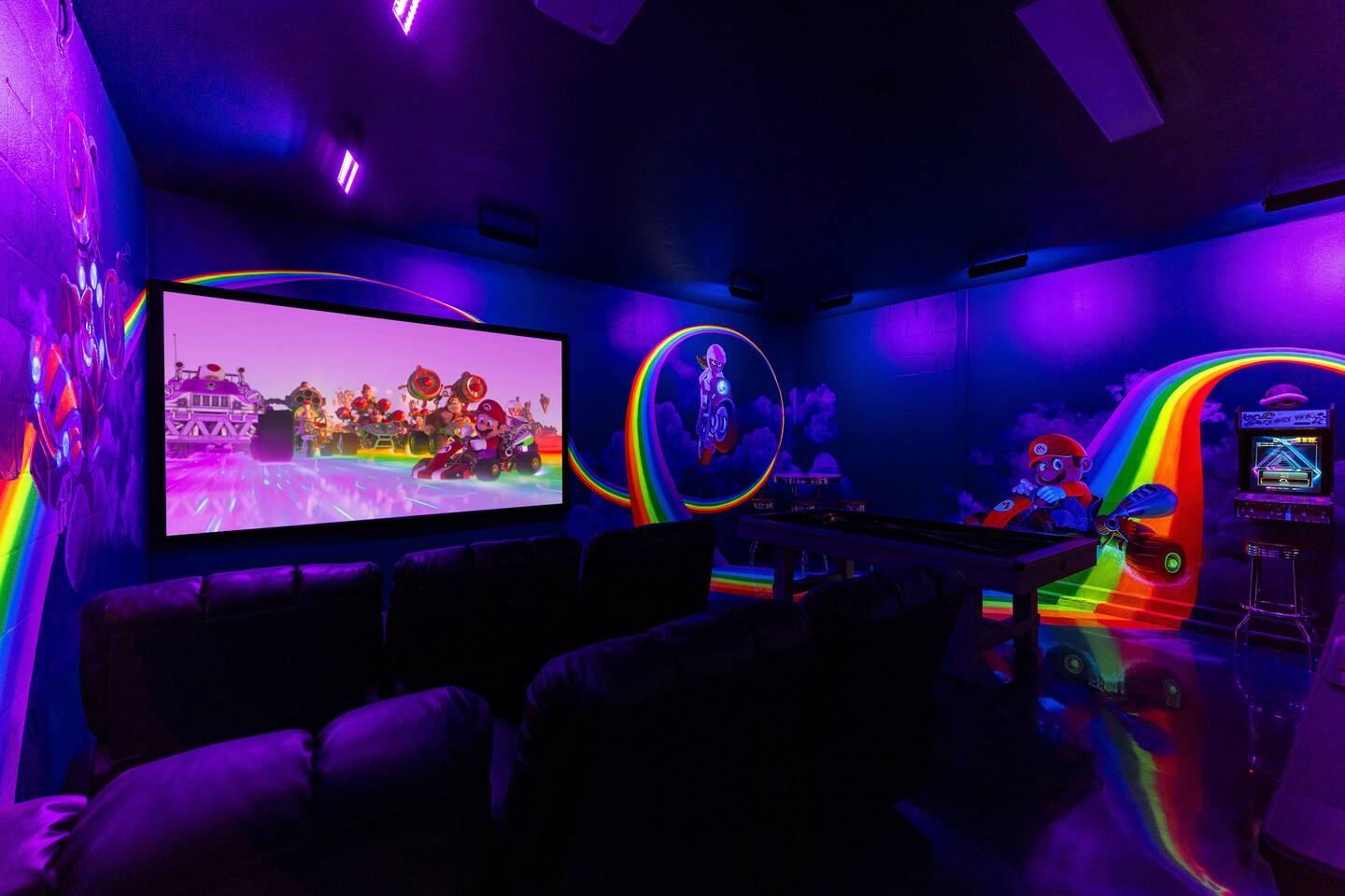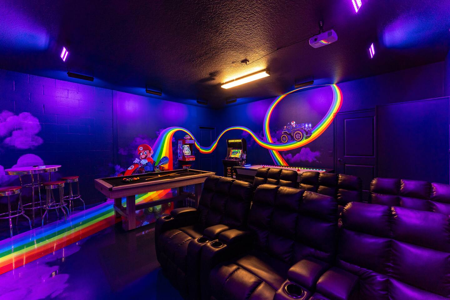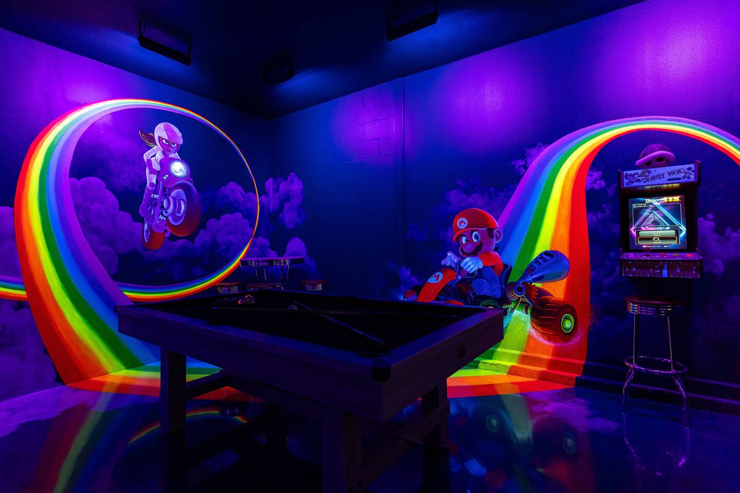 First Floor Walkthrough: Step into your luxurious vacation home and discover the highlights of the first floor. 🛏️ King Suites: Begin with two luxurious King Suites designed for ultimate comfort. Each suite features plush bedding and elegant decor, ensuring a restful night's sleep. 🛀 Ensuite Soaking Tub: Unwind in the spacious ensuite soaking tub, perfect for a relaxing bath after a day of exploring. 🖥️ Dedicated Workspace: You'll find a dedicated workspace, ideal for catching up on emails or planning your next adventure. 🛋️ Living and Dining Rooms: Enjoy the spacious Living and Dining rooms adorned with tropical decor, creating a warm and inviting atmosphere for your gatherings. 🍲 Fully Equipped Kitchen: Head to the fully equipped Kitchen, where you can whip up delicious home-cooked meals. This culinary haven has everything you need to make your stay delightful. 🎮 Mario Themed Game Room and Cinema: Immerse yourself in the fully immersive Mario-themed game room and Cinema. Play classic arcade games, now with a Pacman machine in place of the previous Donkey Kong. Challenge friends at the air hockey table and billiards, or relax in the lounge space while watching your favorite movies. 🏊 Private Pool and Lanai: Step outside to your enclosed private pool and lanai, where you can enjoy outdoor dining and lounge space. It's perfect for soaking up the sun and enjoying the Florida weather. Second Floor Walkthrough: Head upstairs to continue your exploration of the Orlando Barbie Dream House. 💄 Barbie Themed Bedroom: Start with the iconic Barbie themed bedroom featuring 4 queen-sized beds, creating a whimsical and comfortable space for your group. 🛋️ Barbie Themed Loft: Relax in the Barbie themed Loft, an ideal spot for leisure and fun. It's a great place to unwind and enjoy some downtime. 📷 Custom Barbie Box Photo Booth: Don’t forget to snap a photo in your custom Barbie Box photo booth, capturing memories of your unique stay. 🛏️ King Bedrooms: Discover three additional King Bedrooms, each thoughtfully designed to ensure you sleep soundly. 🕸️ Spiderverse and Star Wars Themed Rooms: For a more immersive experience, explore the Spiderverse themed room with a bunk bed (2x Twin) and the Star Wars themed room with twin beds, perfect for creating memorable adventures. As our guest, you’ll enjoy access to The Oasis Club and The Retreat Club, featuring resort-style amenities. You'll also have access to newly refreshed tennis courts and expanded pickleball courts, offering more space for our growing pickleball community. Enjoy every moment in this stunning vacation home designed to provide luxury, excitement, and unforgettable experiences.