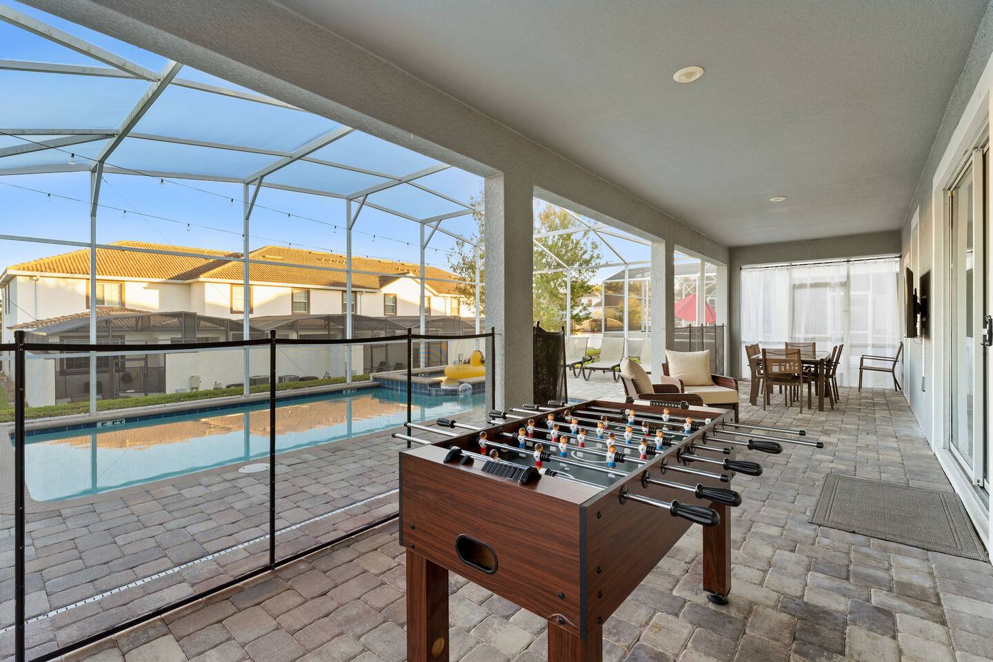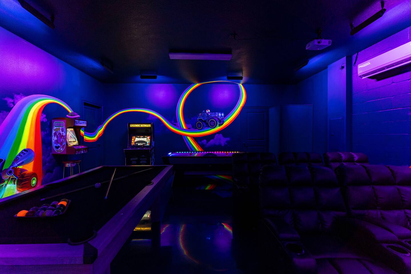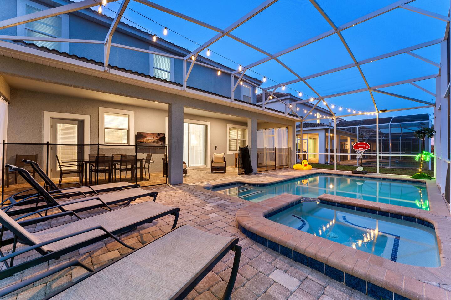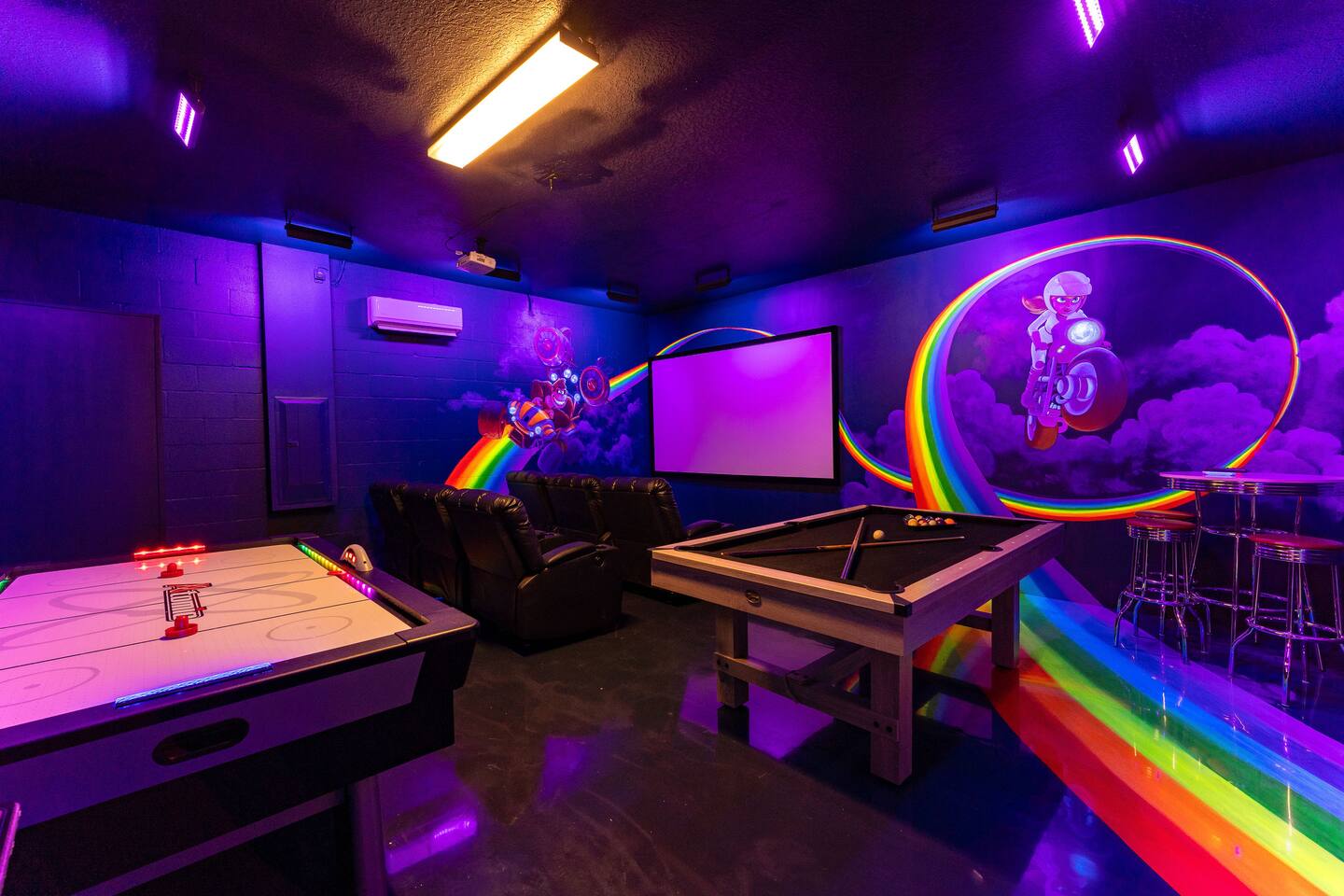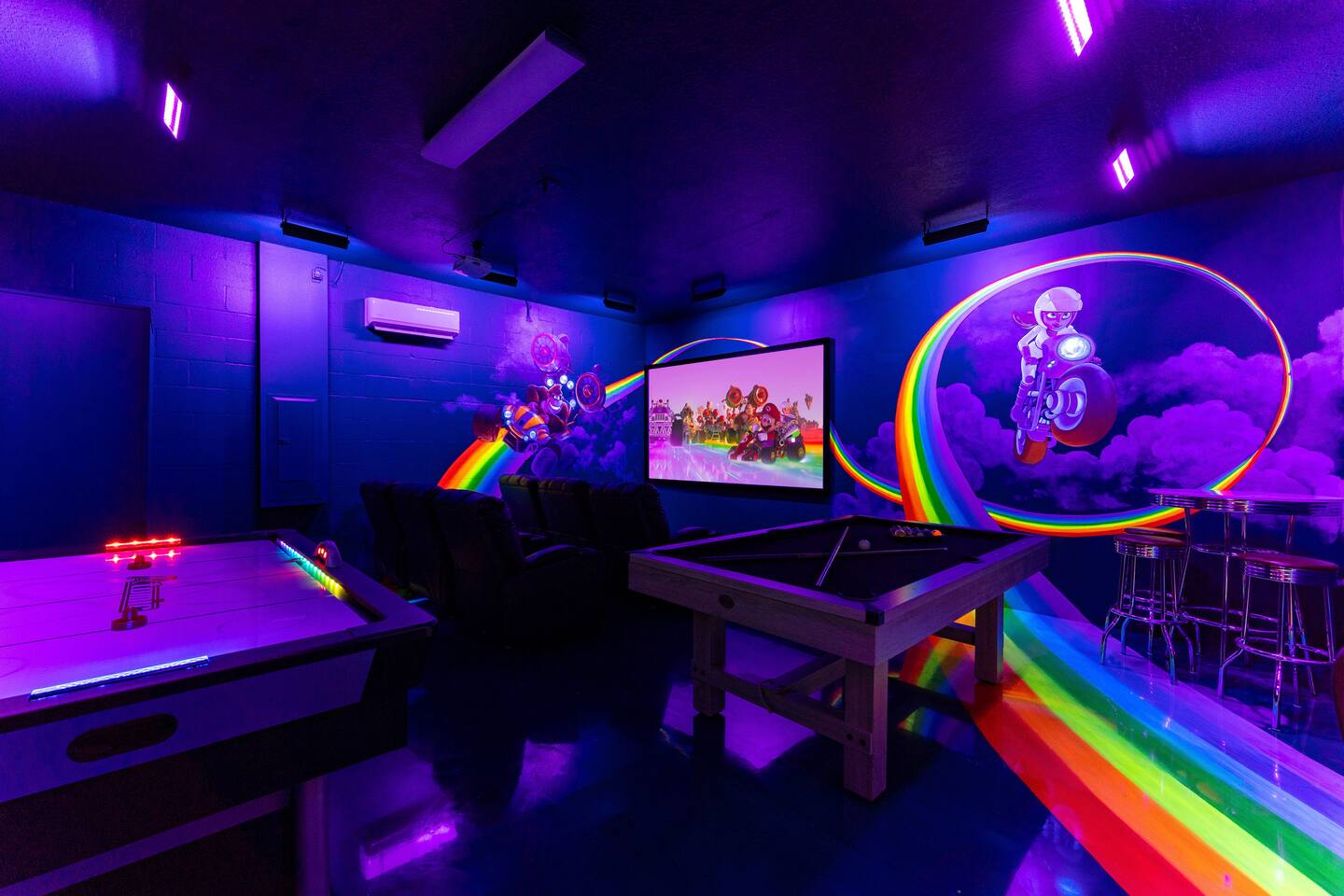 First Floor Walkthrough: Step into your luxurious vacation home and discover the highlights of the first floor. 🛏️ King Suites: Begin with two luxurious King Suites designed for ultimate comfort. Each suite features plush bedding and elegant decor, ensuring a restful night's sleep. 🛀 Ensuite Soaking Tub: Unwind in the spacious ensuite soaking tub, perfect for a relaxing bath after a day of exploring. 🖥️ Dedicated Workspace: You'll find a dedicated workspace, ideal for catching up on emails or planning your next adventure. 🛋️ Living and Dining Rooms: Enjoy the spacious Living and Dining rooms adorned with tropical decor, creating a warm and inviting atmosphere for your gatherings. 🍲 Fully Equipped Kitchen: Head to the fully equipped Kitchen, where you can whip up delicious home-cooked meals. This culinary haven has everything you need to make your stay delightful. 🎮 Mario Themed Game Room and Cinema: Immerse yourself in the fully immersive Mario-themed game room and Cinema. Play classic arcade games, now with a Pacman machine in place of the previous Donkey Kong. Challenge friends at the air hockey table and billiards, or relax in the lounge space while watching your favorite movies. 🏊 Private Pool and Lanai: Step outside to your enclosed private pool and lanai, where you can enjoy outdoor dining and lounge space. It's perfect for soaking up the sun and enjoying the Florida weather. Second Floor Walkthrough: Head upstairs to continue your exploration of the Orlando Barbie Dream House. 💄 Barbie Themed Bedroom: Start with the iconic Barbie themed bedroom featuring 4 queen-sized beds, creating a whimsical and comfortable space for your group. 🛋️ Barbie Themed Loft: Relax in the Barbie themed Loft, an ideal spot for leisure and fun. It's a great place to unwind and enjoy some downtime. 📷 Custom Barbie Box Photo Booth: Don’t forget to snap a photo in your custom Barbie Box photo booth, capturing memories of your unique stay. 🛏️ King Bedrooms: Discover three additional King Bedrooms, each thoughtfully designed to ensure you sleep soundly. 🕸️ Spiderverse and Star Wars Themed Rooms: For a more immersive experience, explore the Spiderverse themed room with a bunk bed (2x Twin) and the Star Wars themed room with twin beds, perfect for creating memorable adventures. As our guest, you’ll enjoy access to The Oasis Club and The Retreat Club, featuring resort-style amenities. You'll also have access to newly refreshed tennis courts and expanded pickleball courts, offering more space for our growing pickleball community. Enjoy every moment in this stunning vacation home designed to provide luxury, excitement, and unforgettable experiences.