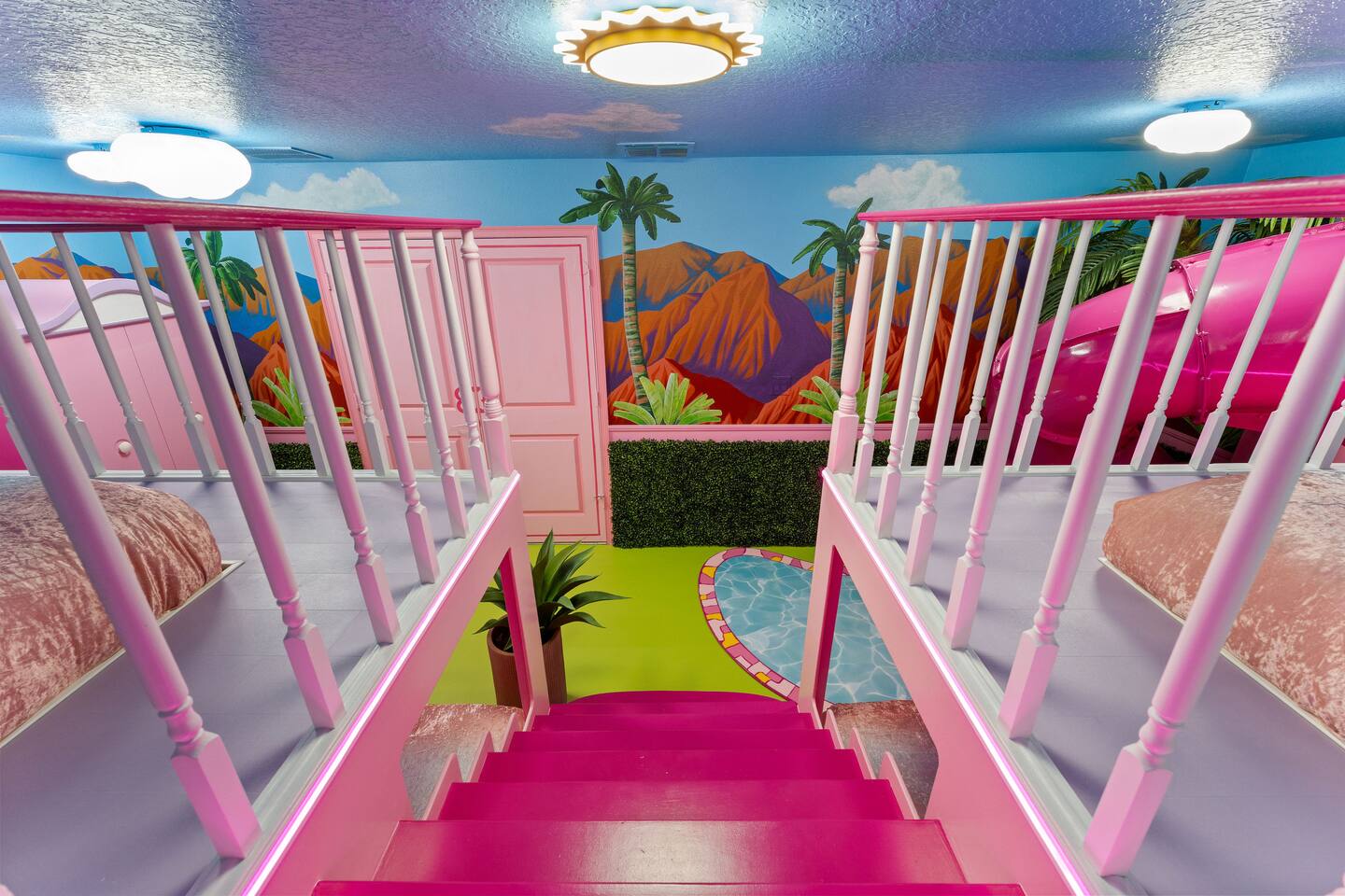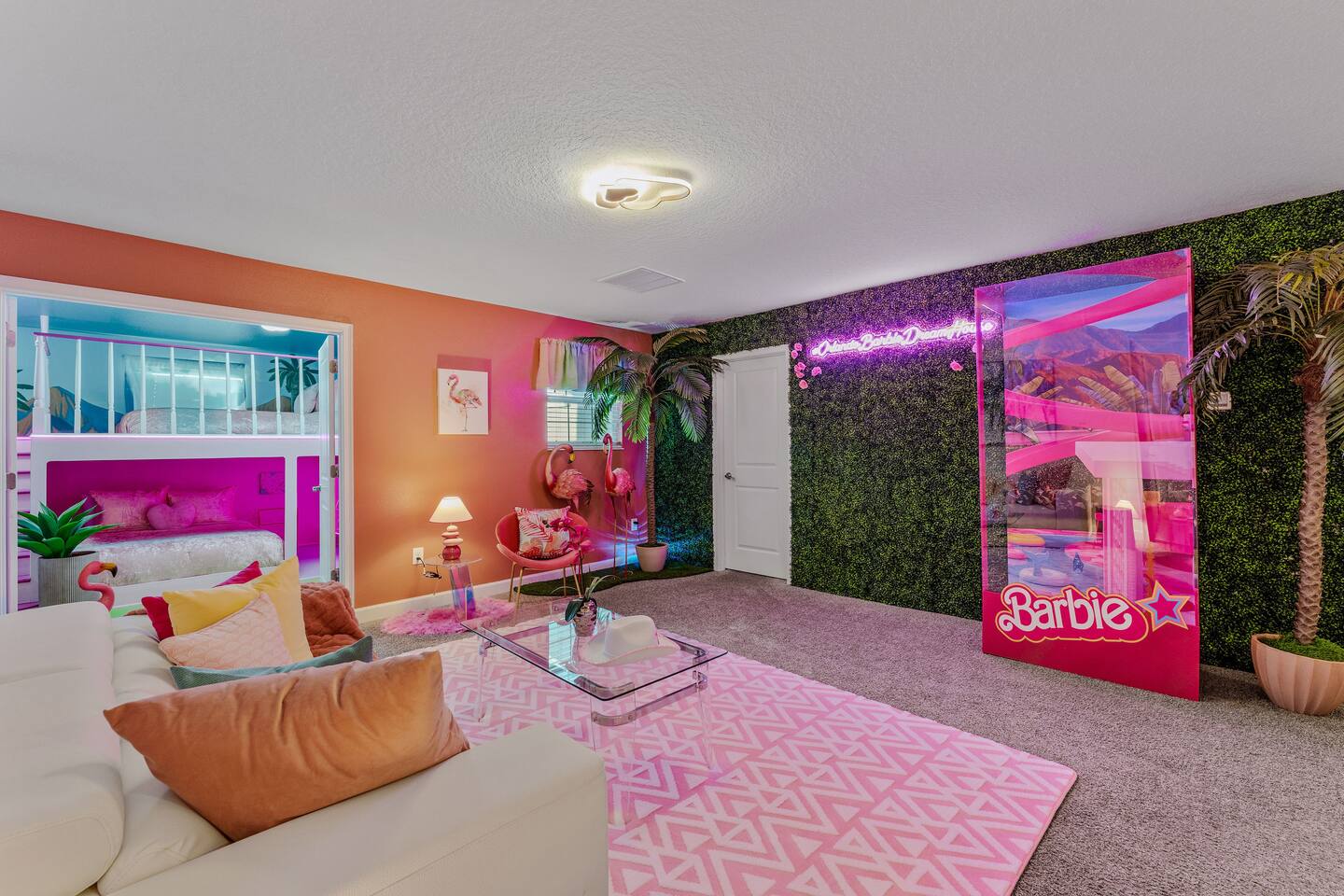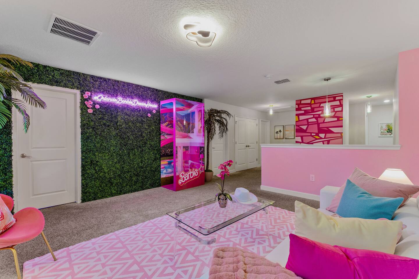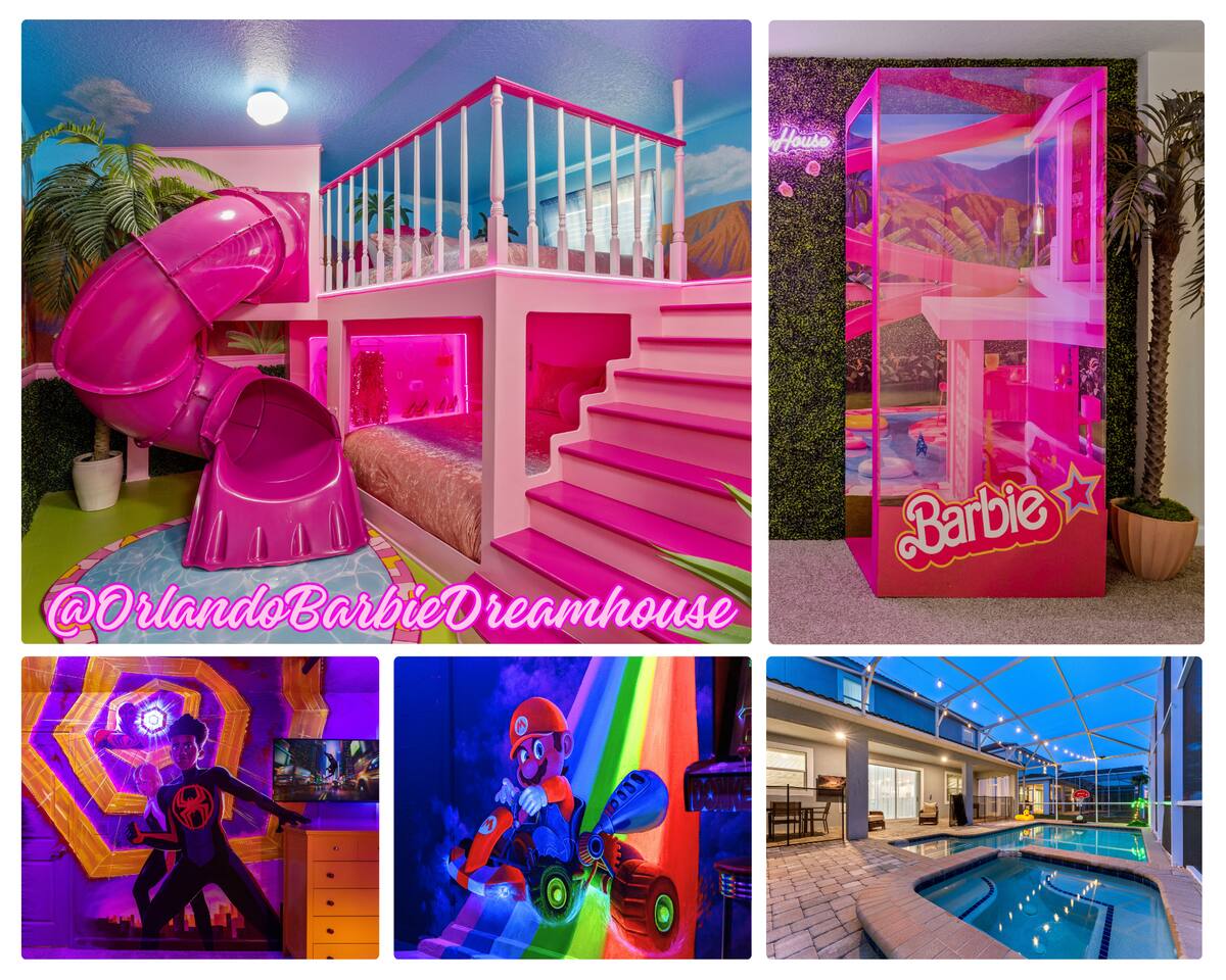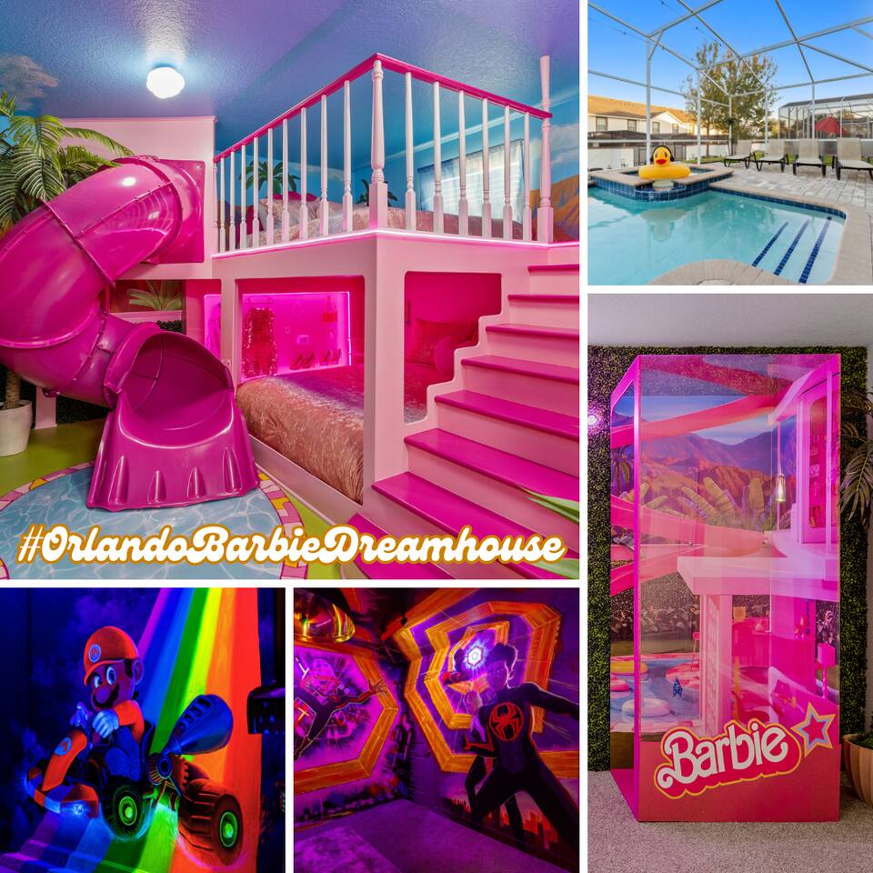 Picture this: You push open the door to your dream Orlando getaway! Welcome to the #OrlandoBarbieDreamHouse, nestled in Champions Gate Resort, Orlando's top spot for fun. This stunning vacation home is perfect for groups who can't wait to explore the magic of Disney. Every detail, from the iconic Barbie room to the epic Mario game room, is designed by renowned Magic Interiors Orlando to make your trip unforgettable!